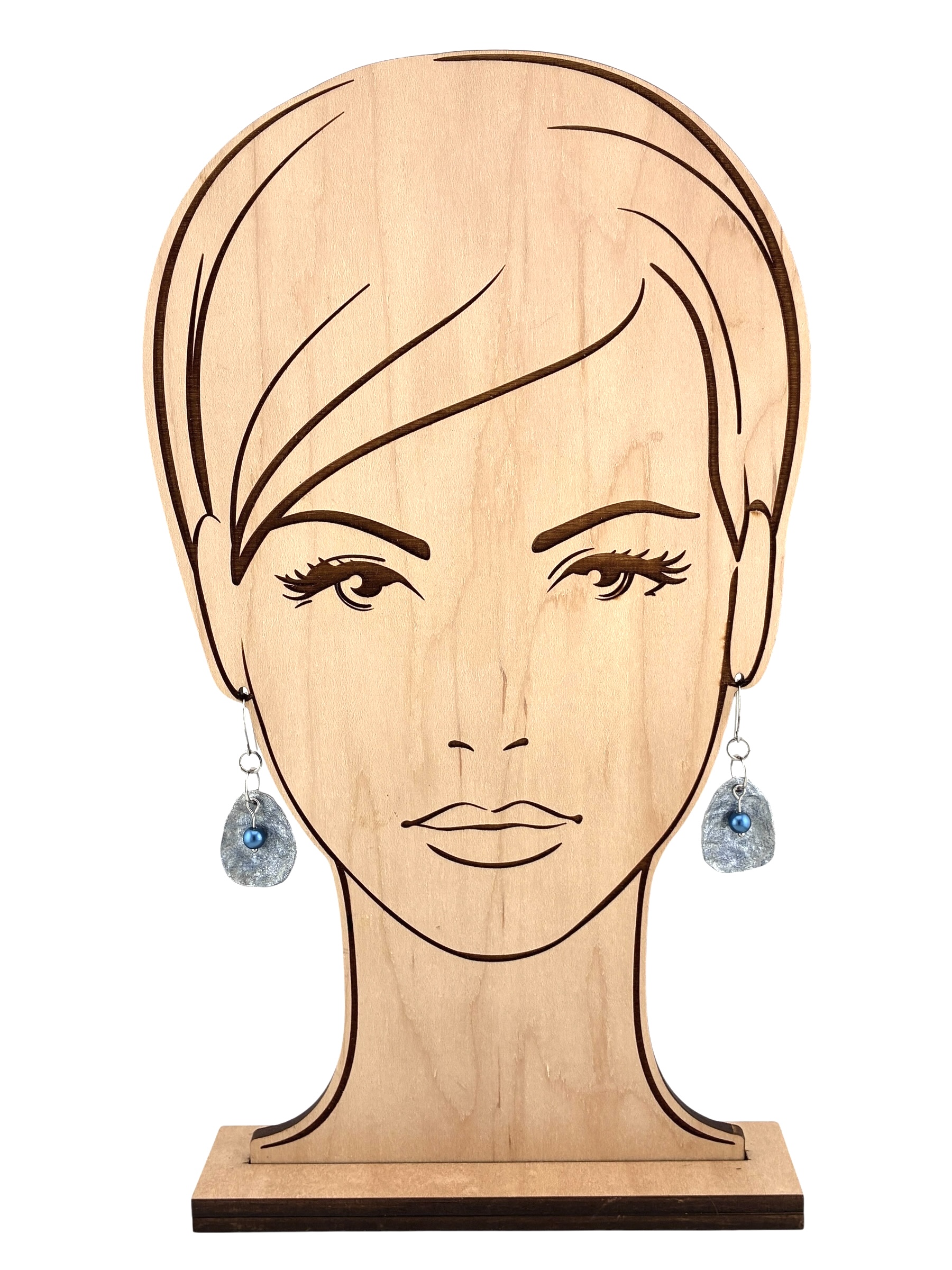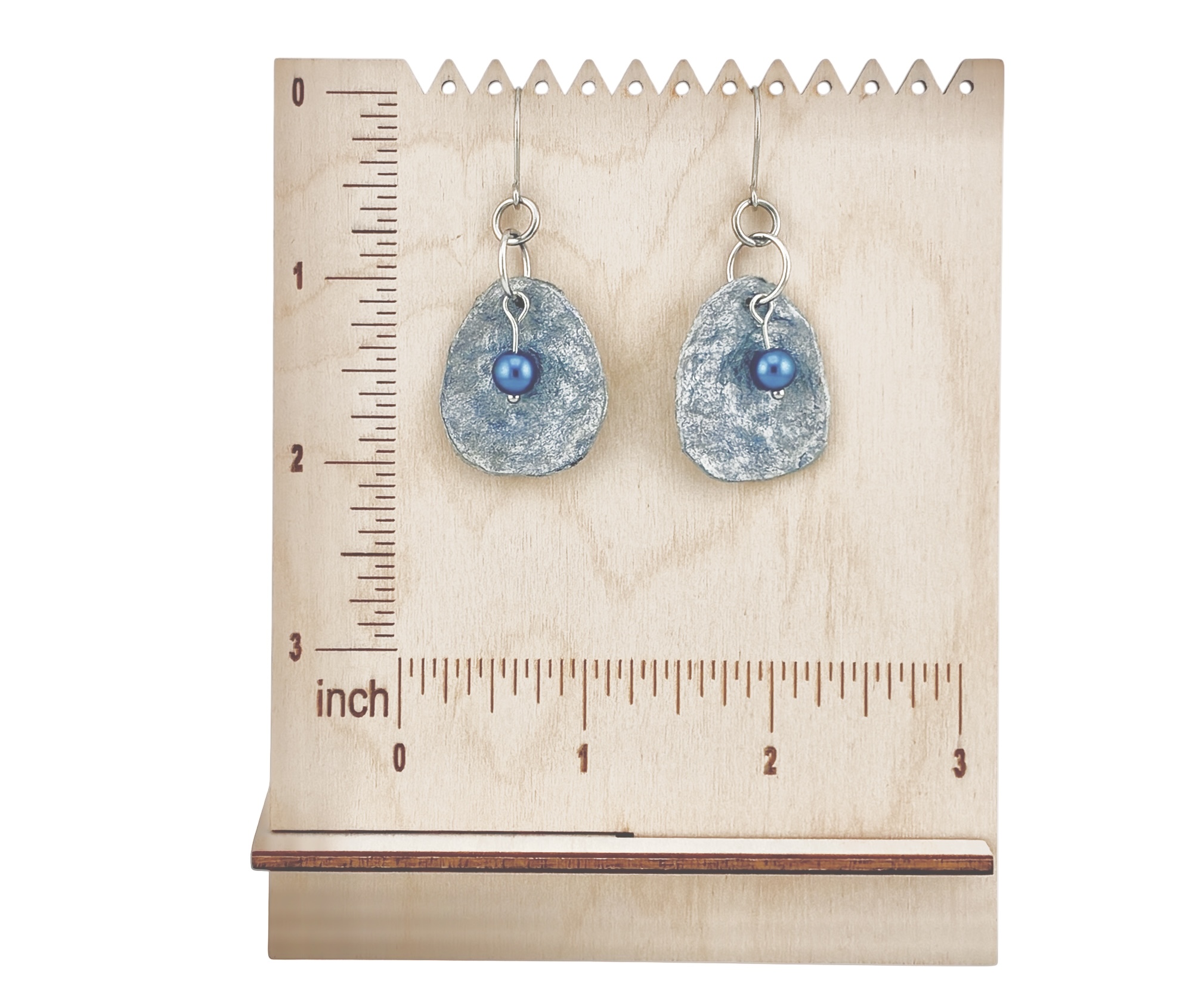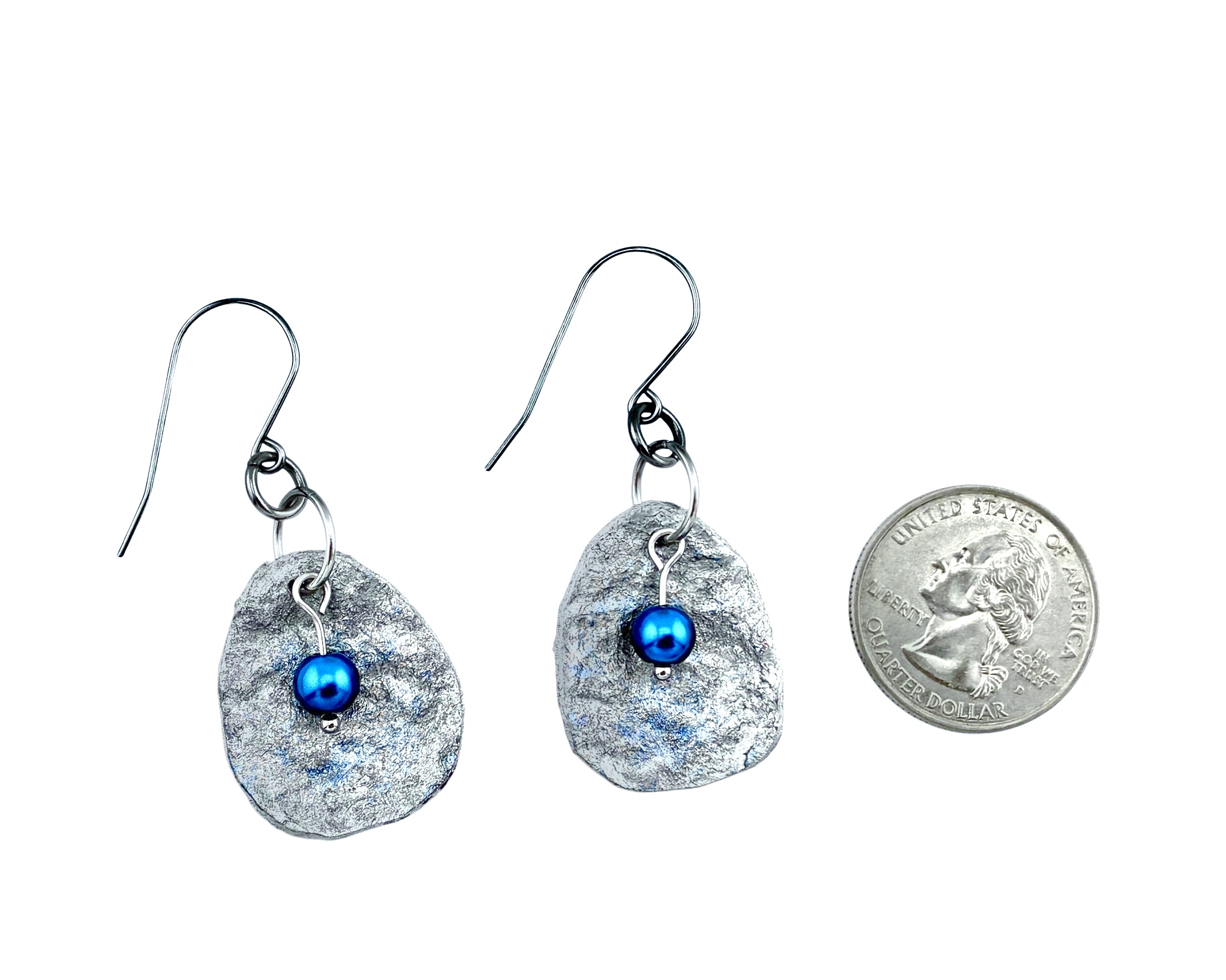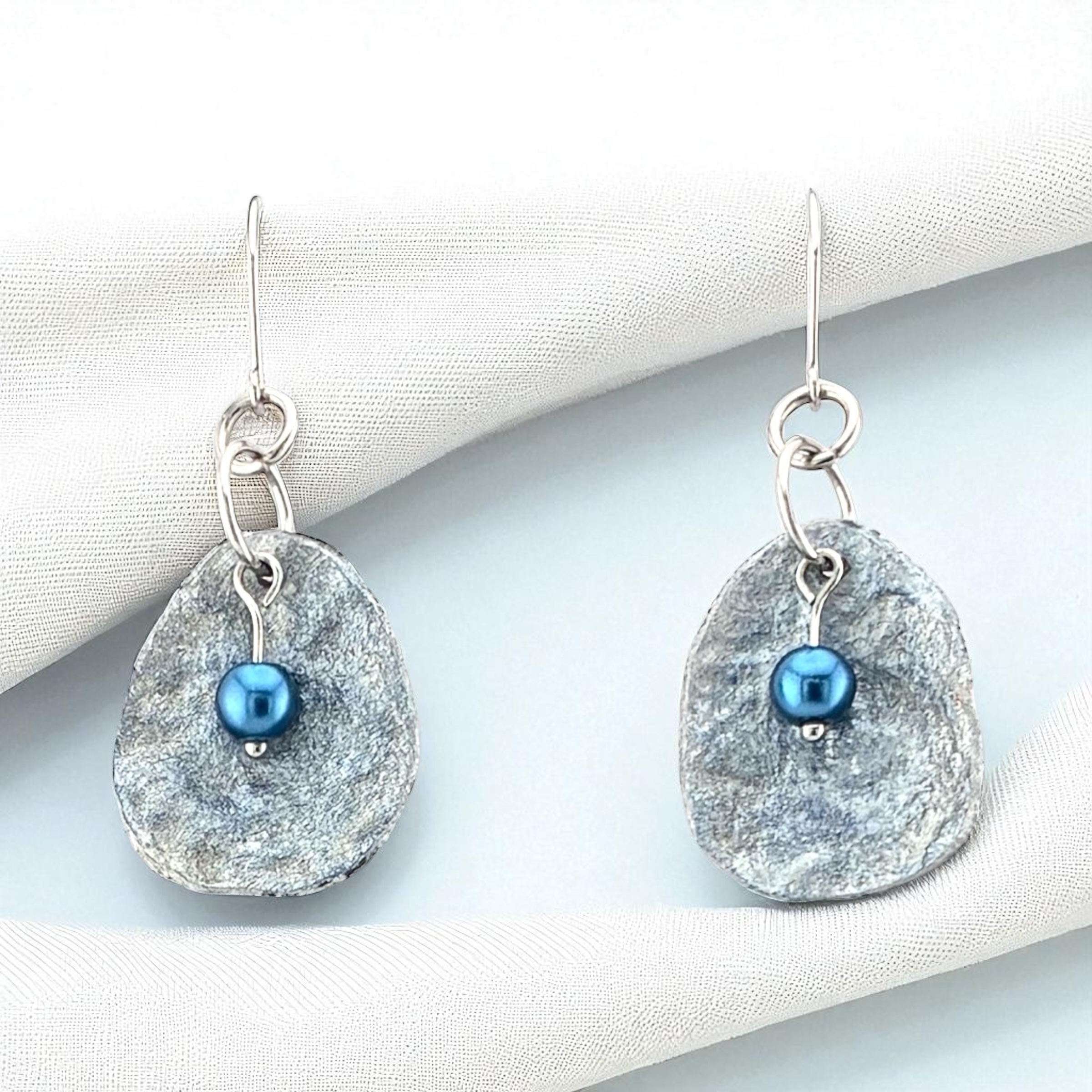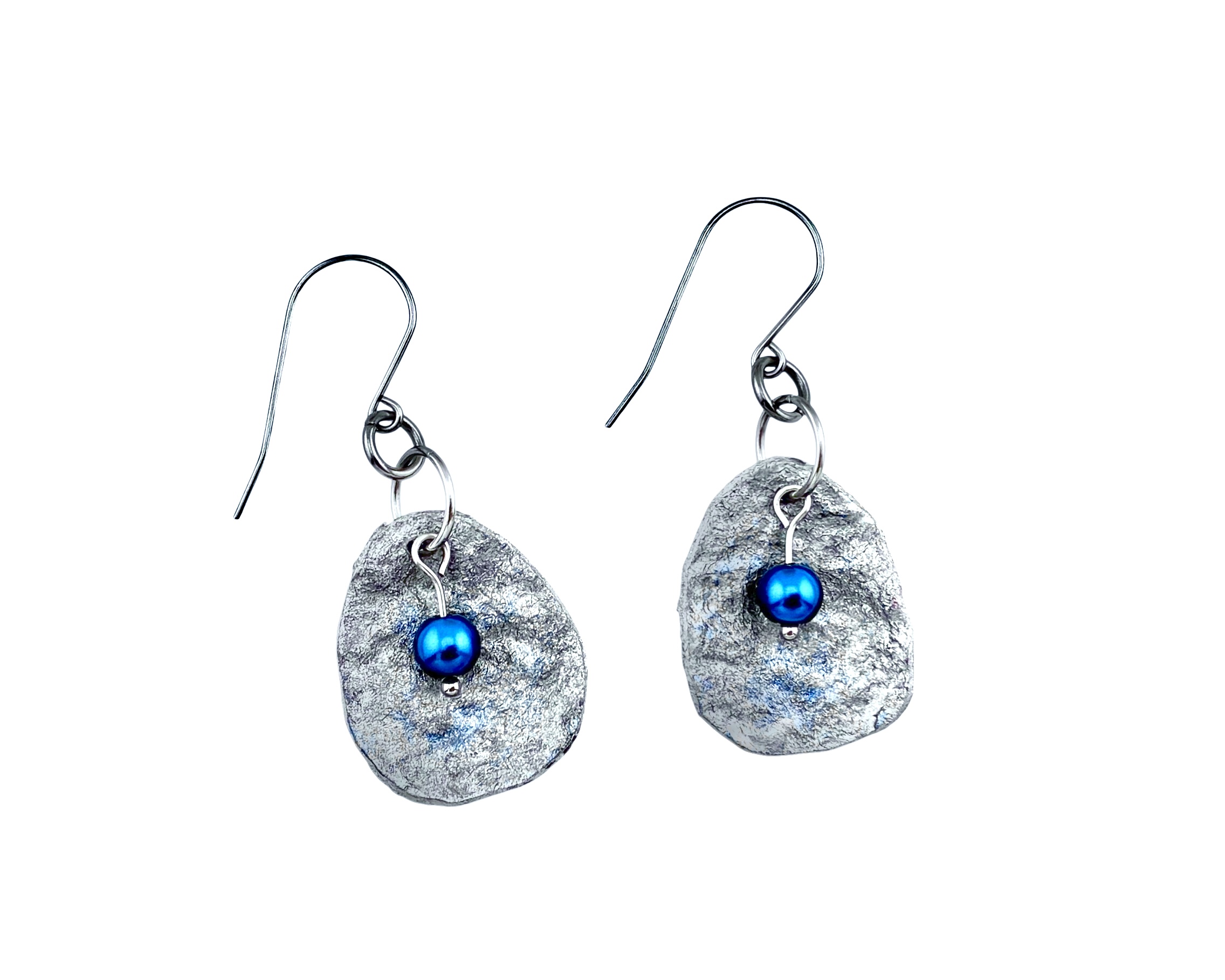 Handmade from upcycled paperboard, these lightweight earrings resemble hammered metal so closely that the only way to be certain they aren't is to touch them. Metallic silver paint is overlaid with a hint of blue and embellished with a blue glass pearl bead. These earrings can easily go from casual to dressy. They are protected with a durable, water-resistant finish for everyday wear. So lightweight you may forget you're wearing them!